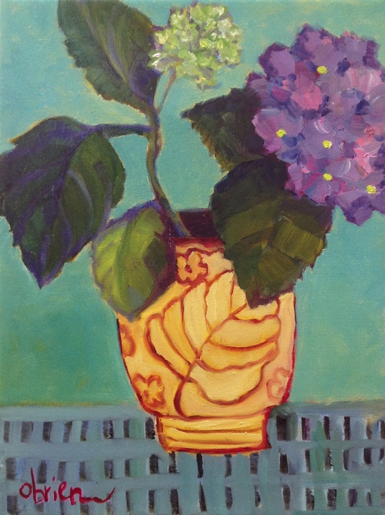 Lets paint a rustic flower arrangement still life. Blue globe vase with iris.